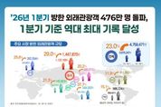 (플러스인뉴스) 문화체육관광부는 올해 1분기(1~3월) 한국을 방문한 외국인 관광객이 약 476만 명을 기록하며, 3월 중동사태 발생에도 불구하고 1분기 기준 역대 최대 규모를 달성했다고 밝혔다. 이는 2025년 같은 기간 대비 23% 증가한 수치이며, 특히 3월에는 외래객 약 206만 명이 방한해 월별 기준으로도 최대 실적을 경신했다. ‘케이-컬처’의 세계적 인기와 더불어 민관의 적극적인 외래관광객 유치 노력이 결실을 본 것으로 분석된다. 시장별로 보면, 중국 관광객이 145만 명(+29%)을 돌파하며 가장 큰 비중을 차지했고, 일본 관광객도 94만 명(+20.2%)이 한국을 찾으며 성장세를 이어갔다. 대만 관광객은 54만 명(+37.7%)까지 증가하여 주요 시장 중 증가세가 가장 두드러졌다. 그 외 미국, 유럽 등 원거리 시장 외래객도 69만 명(+17.1%)으로 증가하며 방한 시장 다변화를 이끌었다. 올해 1분기에는 크루즈 관광 시장의 성장도 돋보였다. 제주·부산·인천 등 주요 기항지로 입항한 크루즈선은 총 338척(항차 기준)으로 전년 같은 기간 대비 52.9% 증가했다. 이는 정부가 추진해 온 기항지 관광 콘텐츠