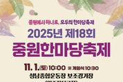 (플러스인뉴스) ‘제18회 중원한마당축제’가 오는 11월 1일 오전 10시부터 오후 2시 30분까지 2000여 명이 참석한 가운데 성남종합운동장 보조경기장에서 열린다. 성남시 중원구가 후원하고, 중원한마당축제 추진위원회가 주최·주관해 열리는 이번 행사는 ‘중원에서 하나로, 모두의 한마당 축제’를 주제로 진행된다. 이날 특설무대에선 11개 동 주민 대표가 출연해 넘치는 끼와 노래 실력을 선보이는 ‘우리 동네 인기스타’ 공연이 펼쳐진다. 초청 가수 윤수현의 ‘천태만상’ 등 트로트 공연, 신인 아이돌 걸그룹 아스텔의 ‘슈퍼노바’, ‘아일랜드’ 등의 공연, 중원유스센터 청소년 보컬 동아리와 댄스 동아리 공연도 열려 축제 분위기를 달군다. 시민 체험 행사도 다양하다. 행사장 곳곳에 총 11개 체험 부스를 설치해 4차산업과 관련한 드론 축구, 가상현실(VR) 트럭 체험, 배틀 로봇 등과 페이스페인팅, 목공 체험 등을 해볼 수 있다. 중원구 관계자는 “주민 간 화합을 도모하고, 신나고 활기찬 지역 분위기를 조성하는 장이 될 것”이라고 말했다. [뉴스출처 : 경기도 성남시]