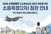 (플러스인뉴스) 수원특례시가 수원비행장 인근 주민들의 소음 피해 보상 근거가 될 국방부의 ‘수원비행장 소음 영향도 조사 2차 소음측정’ 주민 참관 참여자를 모집한다. 4월 28일까지 새빛톡톡으로 신청할 수 있다. 소음측정은 4월 30일부터 5월 8일까지 24시간 연속 측정 방식으로 진행된다. 측정 과정의 공정성과 투명성을 높이기 위해 시민이 참관할 수 있도록 했다. 대상 지점은 ▲서평초(서둔동) ▲평화주택(평동) ▲탑동초(탑동) ▲거산아파트(금곡동) ▲고색초(고색동) ▲수원아이파크6단지(권선2동) 등이다. 1차 소음측정(지난해 8월) 대상지와 동일하다. 소음측정은 ‘군용비행장·군사격장 소음 방지 및 피해 보상에 관한 법률’에 따라 진행되며, 군용비행장 소음 영향도 조사 예규를 따른다. 지난해 8월 이뤄진 1차 측정 결과와 이번 2차 결과는 분석·검증을 거쳐 올해 말 국방부에서 소음대책지역을 지정·고시할 때 활용될 예정이다. 수원시 관계자는 “소음 영향도 조사는 주민 보상과 직결되는 중요한 절차인 만큼 시민 참여로 신뢰도를 높일 것”이라며 “관심 있는 시민들이 적극적으로 참여해 주길 바란