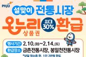 (플러스인뉴스) 파주시는 2026년 설 명절을 맞아 고물가로 인한 시민들의 가계 부담을 덜고 지역 전통시장 활성화를 도모하기 위해 ‘설맞이 농축산물 온누리상품권 환급 행사’를 실시한다. 이번 행사는 농림축산식품부가 주관하는 ‘농축산물 할인지원’사업의 일환으로, 본격적인 제수용품 구매 기간인ق월 10일부터 14일까지 5일간 관내 전통시장 2곳(봉일천전통시장, 금촌전통시장)에서 진행된다. 행사 기간 동안 참여 점포에서 국산 농축산물을 구매한 고객은 구매 금액에 따라 1만 원 또는 2만 원 상당의 온누리상품권을 환급받을 수 있다. 환급 기준은 ▲구매 금액이 3만 4천원 이상 6만 7천 원 미만일 경우 1만 원 ▲6만 7천 원 이상일 경우 2만 원이며, 환급 한도는 1인당 최대 2만 원이다. 단, 예산 소진 시 행사는 조기 종료될 수 있다. 환급을 희망하는 고객은 당일 구매 영수증과 신분증을 지참해 각 시장 내에 마련된 지정 환급처를 방문하면 된다. 환급 대상 품목은 국산 농산물 및 축산물이며, 수입산 농축산물이나 법인카드 결제 내역, 제로페이 모바일 상품권 결제 내역 등은 환급 대상에서 제외된다. 환급을