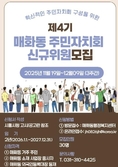 (플러스인뉴스) 시흥시 매화동 행정복지센터는 12월 9일까지 ‘제4기 매화동 주민자치회’ 신규위원 30명을 공개 모집한다. 신청은 매화동 행정복지센터 방문 또는 전자우편을 통해 가능하다. 매화동 주민자치회는 지역의 다양한 현안에 대해 주민 스스로 자치계획을 수립하고, 주민총회를 통해 실행 방향을 결정하는 주민대표기구다. 제3기 매화동 주민자치회의 임기(2024.01.01.~2025.12.31.)가 만료됨에 따라 '시흥시 주민자치회 및 주민자치센터 설치·운영에 관한 조례'에 기반한 매화동 발전의 혁신적인 마인드를 가진 제4기 신규위원을 선발하며 위원 임기는 2년이고 중도 해촉이 가능하다. 신청 자격요건은 ▲매화동에 주민등록이 돼 있는 사람 ▲매화동에 사업장 주소를 두고 있는 사업장에 종사하는 사람 ▲매화동에 소재한 학교, 기관, 단체 등에 속한 사람 ▲영주의 체류자격을 갖춘 외국인으로서 매화동의 외국인등록대장에 등재된 사람이며, 타 동 주민자치회 위원이나 매화동 관계단체 소속 주민은 지원할 수 없다. 선발된 주민자치회 위원들은 매화동의 발전 방향을 논의하고 자치계획을 수립·집행하는 등 실질적인 지역