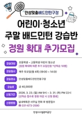 (플러스인뉴스) 안성시시설관리공단은 안성 시민 생활체육 활성화를 위해 현재 운영 중인 주말 어린이・청소년 배드민턴 강습반 정원을 확대하고 추가 수강생을 모집한다고 밝혔다. 이번 주말 어린이・청소년 배드민턴 강습반은 개설 이후 학부모와 수강생들의 높은 관심 속에 연일 정원이 마감될 정도로 큰 호응을 얻고 있다. 특히 주말을 활용해 어린이와 청소년들이 체계적으로 생활 체육을 접할 수 있다는 점에서 학부모들의 만족도가 높은 프로그램으로 자리 잡고 있다. 공단은 이러한 시민 수요를 적극 반영하기 위해 강습반 정원을 기존보다 확대하고, 오는 3월 23일 오전 9시부터 3월 31일 오후 10시까지 초등학생부터 고등학생까지의 어린이·청소년을 대상으로 선착순 10명을 추가 모집한다. 신청은 실내체육관 사무실에 전화로 문의한 뒤 방문 접수로 진행될 예정이다. 이정찬 이사장은 “시민들의 높은 관심에 부응하기 위해 앞으로도 누구나 쉽게 참여할 수 있는 생활체육 환경을 만들어 가겠다”고 전했다. 현재 안성시시설관리공단에서는 시민들의 건강증진을 위하여 주말 강습반 외 매주 2회(화,목) 오전‧오후‧저녁‧시니어 배드민턴 강