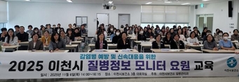 (플러스인뉴스) 이천시는 11월 6일 보건소 3층 대회의실에서 감염병의 예방 및 신속한 대응을 위해 질병정보 모니터 요원 100여 명을 대상으로 역량강화 교육을 했다. 이번 교육에는 모니터 요원 외에도 보건소 직원도 함께 참여해 감염병 대응 역량을 강화했다. 질병정보 모니터 요원은 학교, 어린이집, 병·의원, 약국, 사회복지시설, 산업체 등의 보건 담당자로 구성되며, 관내에는 209명이 활동하고 있다. 모니터 요원은 소속 기관에서 감염병 예방을 위한 교육, 홍보, 감염병 (의사)환자 발견 및 전염성 질환의 유행 상태를 보건소에 신고하여 지역 내 감염병 예방 및 확산 방지의 역할을 하고 있다. 이날 시는 건국대학교 의과대학 예방의학교실 김형수 교수를 강사로 초빙해 ▲질병정보 모니터 요원의 의무 ▲역학조사에서 모니터링 기관의 역할 ▲감염병 발생, 신고, 역학조사, 방역, 보고 등 단계별 조치 사항 ▲감염병 확산 방지를 위한 역할 등을 교육했다. 경기도의료원 이천병원 유은상 감염관리팀장은 ▲계절별 유행하는 감염병 ▲관내 감염병 발생 동향과 대응 사례 등을 교육하고 ▲감염병 대응 모의훈련 사례를 공유했다. 김경희 시장