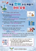 (플러스인뉴스) 오산시는 겨울철 기온 강하로 인한 수도계량기 동파·동결 사고 예방을 위해 이달부터 내년 3월까지 ‘겨울철 수도계량기 동파 예방 대책’을 본격 추진한다고 밝혔다. 시는 24시간 종합상황실을 운영하고 응급복구반을 편성하여 동파 발생 시 신속히 복구할 수 있는 체계를 구축, 시민 불편 최소화와 안정적인 맑은물 공급에 만전을 기할 방침이다. 또한 시민들의 자발적인 참여와 관심이 동파 예방의 핵심이라는 점에서, 동파 예방법 및 동결 시 조치요령이 담긴 홍보물과 동파 방지팩 960개를 각 동 행정복지센터에 배포해 무료로 제공하고 있다. 수도계량기 동파를 예방하기 위한 주요 요령으로는 ▲계량기 보호통 내부에 보온재 채우기 ▲옥외 수도관 및 화장실 배관 보온처리 ▲장기간 외출 시 수도꼭지를 조금 틀어 물이 흐르도록 하기 ▲계량기가 얼었을 경우 미지근한 물이나 헤어드라이기로 천천히 녹이기 등이 있다. 김윤상 수도과장은 “다가오는 한파에 대비해 시민 불편이 최소화되도록 최선을 다하겠다”며 “각 가정에서도 수도관과 계량기 보온 조치를 철저히 해 동파 예방에 적극 동참해 주시길 바란다”고 당부했다.