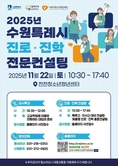 (플러스인뉴스) 수원시청소년청년재단 청소년희망등대는 오는 11월 22일 오전 10시 30분부터 오후 5시 40분까지 천천청소년청년센터에서 '2025. 수원특례시 진로진학전문컨설팅'을 개최한다. 이번 행사는 급변하는 입시 환경 속에서 학생과 학부모에게 실질적인 정보를 제공하고, 맞춤형 진로 설계를 지원하기 위해 마련됐다. 행사는 두 개의 주요 프로그램으로 구성된다. 첫 번쨰로 입시전략 특강(10:30~12:00)에서는 ‘고교학점제 이해와 변화하는 대입의 준비’를 주제로 진행된다. 교육 현장의 전문가가 참여하여 고교학점제에 따른 대입 변화와 이에 대응하는 학습 전략을 제시할 예정이다. 두 번째 프로그램인 진로진학 컨설팅(13:00~17:40)에서는 특목고자사고 대비컨설팅과 맞춤형 진로진학 종합컨설팅이 함꼐 진행된다. 참가 학생들은 전문가와 1:1로 상담하며 자신에게 적합한 진로 방향과 학습 계획을 구체화할 수 있다. [뉴스출처 : 경기도 수원시]