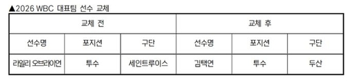 (플러스인뉴스) KBO 전력강화위원회는 부상으로 인해 WBC 참가가 어려워진 세인트루이스 라일리 오브라이언을 대체할 선수로 두산 김택연을 확정하고 WBC 조직위에 선수 교체 승인을 요청했다. [뉴스출처 : KBO]
