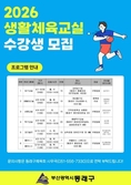 (플러스인뉴스) 부산 동래구는 지역 주민의 생활체육 참여 확대와 건강한 여가 활동 지원을 위해 ‘2026년 상반기 생활체육교실’ 수강생을 모집한다고 밝혔다. 동래구체육회에서 운영하는 생활체육교실은 당구, 생활 호신술, 씨름, 탁구, 파크골프, 폴댄스 등 다양한 종목으로 구성돼 있으며 동래구에 거주하는 초보자를 대상으로 무료로 운영된다. 수강을 희망하는 주민은 3월 20일 오후 5시까지 동래구체육회 누리집을 통해 신청할 수 있으며, 선착순으로 마감된다. 자세한 사항은 동래구체육회에 문의하면 된다. 동래구 관계자는 “생활체육교실을 통해 주민들이 다양한 체육활동을 경험하고 건강한 여가생활을 즐길 수 있기를 기대한다”라며 “앞으로도 생활체육 활성화를 위해 다양한 프로그램을 지속적으로 운영하겠다”라고 말했다. [뉴스출처 : 부산시동래구]