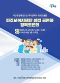 (플러스인뉴스) 파주시는 오는 29일 14시, 교하도서관 3층 소극장에서 ‘파주시복지재단 설립 공론화 정책토론회’를 개최한다고 밝혔다. 이번 토론회는 파주시복지재단 설립을 앞두고 시민, 전문가, 현장 종사자의 다양한 의견을 수렴해 재단 설립의 필요성과 발전 방향을 함께 모색하기 위해 마련됐다. 토론회는 김민철 서영대학교 사회복지행정학과 교수의 기조 강연을 시작으로, 파주시 복지기획팀장의 주제 발표가 이어진다. 이어 한지원 두원공과대학교 교수가 좌장을 맡아 토론을 진행하며, 이보경 파주시문산종합사회복지관 관장, 오민수 경기복지재단 선임연구위원, 박윤근 화성시복지재단 사업본부장 등이 참석해 열띤 논의를 펼칠 예정이다. 토론에서는 ▲파주시복지재단 설립의 필요성과 추진 개요 ▲파주시 여건을 반영한 복지재단의 발전 방향 ▲재정 자립 및 지속가능성 확보 방안 등 다양한 주제가 심도 있게 논의될 예정이다. 김은숙 복지정책국장은 “파주시복지재단은 시민의 삶을 보다 세밀하게 지원하고, 지역 현장의 목소리를 반영한 ‘파주형 복지모델’을 실행할 구심점이 될 것”이라며, “이번 토론회를 통해 파주시 복지 정책의 새로운