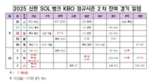 (플러스인뉴스) KBO는 26일(금) 2025 신한 SOL뱅크 KBO 정규시즌 2차 잔여 경기 일정을 확정했다. 편성된 경기는 1차 잔여 경기 일정에서 우천 취소된 후 편성되지 않았던 7경기이며, 10월 3일(금)까지 편성됐다. 경기가 우천 등으로 취소될 경우 발표된 일정의 예비일로 우선 편성되며, 다음 날 동일 대진일 경우 더블헤더로 편성된다. 예비일이 없을 경우 추후 편성된다. 경기 개시시간은 평일 18시 30분, 토요일 17시, 일요일 14시이다. 또한 10월 3일(금) 경기는 해당 구단의 전날 경기 후 이동을 고려하여 17시에 편성한다. 한편, 우천 등으로 연기되는 경기가 포스트시즌 참가팀 이외의 팀간 경기이거나 포스트시즌 진출팀이라도 해당 시리즈와 관계없는 대진일 경우에는 정규시즌 최종일과 와일드카드 결정전 개막일 사이의 이동일 또는 포스트시즌 기간 중에도 경기를 거행할 수 있으며 와일드카드 결정전 진출 구단의 정규시즌 마지막 경기와 와일드카드 결정전 개최일 사이 최소 하루의 이동일을 둘 예정이다. 또한, 정규시즌 제1,5위 구단이 두 팀일 경우에는 KBO 리그 규정에 의거 와일드카드 결정