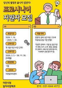 (플러스인뉴스) 이천시는 이천일자리센터와 함께 구직자 맞춤형 취업 지원을 강화하기 위해 프로시니어 1명을 공개 모집한다고 밝혔다. 이번 모집은 풍부한 현장 경험과 전문성을 갖춘 중장년 인력을 활용해 지역 내 일자리 발굴과 취업 연계를 강화하기 위한 것으로, 선발된 사람은 2026년 3월 3일부터 11월 30일까지 이천일자리센터에서 근무하게 된다. 주요 업무는 ▲구직자 및 일자리 발굴 ▲취약계층 대상 동행면접 지원 ▲구직자·기업 대상 화상면접 안내 및 홍보 ▲기타 취업 지원 업무 등이다. 근무 조건은 주 5일, 1일 5시간 근무이며, 보수는 이천시 생활임금을 적용해 월 약 140만 원(기본급 및 주휴수당 포함) 수준이다. 지원 자격은 공고일 기준으로 만 55세 이상 이천시 거주자로, 기업·공공기관 경영·인사·노무·영업·상담 분야 경력자, 교육기관 또는 사회복지 분야 종사 경력자 등 전문직 경력 3년 이상인 경우 지원할 수 있다. 변호사, 공인노무사, 직업상담사, 전산 관련 자격증 소지자 및 직업상담 교육과정 이수자는 우대된다. 접수 기간은 2026년 1월 16일부터 1월 30일 오후 6시