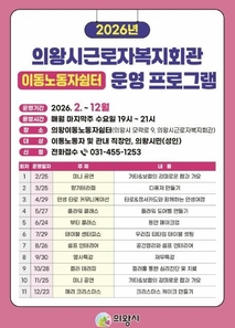 (플러스인뉴스) 의왕시가 매월 마지막 주 수요일, 이동노동자쉼터(모락로 9, 근로복지회관)에서 쉼이 있는‘이동노동자쉼터 프로그램’을 운영한다. 이동노동자들의 정서적 휴식을 지원하고 시민과 함께 소통할 수 있는 교육·문화 프로그램 마련을 위해 기획된 이번 프로그램은 2월 25일, 감미로운 기타와 보컬이 어우러진 팝과 가요의 ‘작은 공연’으로 시작된다. 이후, 시에서는 ▲디퓨저 만들기 ▲재무특강 ▲크리스마스 케이크 만들기 등 참가자들의 일상에 활력을 더해 줄 수 있는 다양한 체험 행사를 편성해 운영할 예정이다. 아울러, 이번 프로그램의 수강생들은 쉼터 1층에 조성 돼 있는 카페테리아도 자유롭게 이용할 수 있다. 프로그램은 이동 노동자와 의왕 시민(성인)이면 누구나 참여할 수 있으며, 오후 7시부터 9시까지 20명 내외로 운영될 예정이다. 프로그램의 신청은 전화또는 현장 등록을 통해 가능하다. 김성제 시장은 “이동노동자 뿐 아니라 일반 시민도 참여할 수 있는 쉼과 배움이 함께하는 프로그램을 마련했다”며 “많은 분들이 이동노동자쉼터를 방문해 유익한 정보도 얻고 휴식을 갖는 뜻깊은 기회를 얻게 되기를 바란다