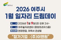 (플러스인뉴스) 여주시는 오는 1월 9일 오후 2시 여주일자리센터(세종로 14번길 18, 중앙프라자 5층)에서 ‘2025년 첫 여주시 일자리드림데이’를 연다. 이번 행사는 새해를 맞아 구직자에게 새로운 출발의 기회를 제공하고, 관내 기업에는 필요한 인재를 연결하기 위해 마련된다. 올해 첫 행사인 이번 일자리드림데이는 이마트 여주물류센터 내 위치한 ㈜이앤원이 참여한다. 모집 직종과 인원은 물류직 2명으로 주요 업무는 지게차를 활용한 물류 입출고작업이다. 일자리드림데이는 관내 기업의 소규모 채용 요청이나 여주일자리센터의 알선으로 매달 운영하며, 참여 기업과 구직자를 대상으로 만족도 조사 실시, 현장의 의견을 반영해 운영 방식을 지속적으로 개선할 계획이다. 시 관계자는 “새해 첫 일자리드림데이가 시민에게 희망과 용기를 전하는 시간이 되길 바란다”라며, “2026년에도 시민의 곁에서 따뜻하게 일자리를 연결하겠다”라고 말했다 [뉴스출처 : 경기도 여주시]