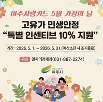 (플러스인뉴스) 여주시는 최근 중동 정세 악화에 따른 물가상승 압력이 높아짐에 따라 민생안정 대책으로 오는 5월 가정의 달 ‘여주사랑카드 특별 인센티브 10%’ 지원을 한다고 밝혔다. 중동 정세 악화로 석유판매가 상승과 더불어 산업 전반에 원재료 상승 부담 가중으로 지방 소비자 물가 상승까지 예상됨에 따라, 여주시는 선제적 민생안정 대책으로 여주사랑카드 인센티브를 기존 8%에서 10%로 확대 지원한다. 여주사랑카드 1인당 월 충전한도는 100만원으로, 이번 특별 인센티브 10% 지원을 통해 받을 수 있는 최대 혜택은 10만원이다. 5월은 어린이날, 어버이날이 속한 달로 가정 내 연중 지출이 가장 많은 달로 여주사랑카드 특별 인센티브 10% 지원 시, 가계지출 부담을 완화하고, 지역 내 소비 촉진으로 지역 소상공인들의 매출 증대에 도움이 될 것으로 예상된다. 이충우 여주시장은 “중동 정세 악화에 따른 경제적 충격이 시민분들의 생활까지 영향을 미치고 있는 상황에서, 여주사랑카드 특별 인센티브 확대 지원이 가계에 많은 도움이 되기를 바란다.”라며, “앞으로도 여주시는 민생경제 안정을 위한 지역경제 활성화 정책을 적극