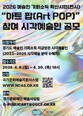 (플러스인뉴스) 경기도와 경기문화재단이 “2026 예술인 기회소득 확산사업(전시)“의 일환으로 진행하는 “아트 팝(Art POP)” 참여 시각예술인을 공개 모집한다. ‘2026 예술인 기회소득 확산사업(전시)’은 2023년부터 2025년까지 '경기도 예술인 기회소득'을 지원받은 시각예술인에게 지속적인 예술 창작 발표의 기회를 제공하고, 도민에게는 문화예술 향유 기회를 확대하기 위해 마련된 행사다. “아트 팝”의 신청 대상은 2023년부터 2025년까지 '경기도 예술인 기회소득'을 지원받은 시각예술 분야의 경기도 거주 예술인이다. 3년 동안 1회라도 지원을 받았다면 신청할 수 있고, 기존 “예술인 기회소득 페스티벌(전시)”에 참여한 이력이 있어도 신청 가능하다. 신청을 원하는 예술인은 국가문화예술지원시스템(NCAS)을 통해 지원신청서, 예술인 기회소득 지급 사실 증빙 자료 등을 제출하면 된다. 특히 이번 “아트 팝”에는 회화, 조각, 공예, 설치, 미디어, 일러스트, 웹툰, 그래피티 아트, 디지털 페인팅 등 모집 분야를 확대해 보다 다양한 시각예술 분야의 예술인들이 참여할 수 있도록 했다.